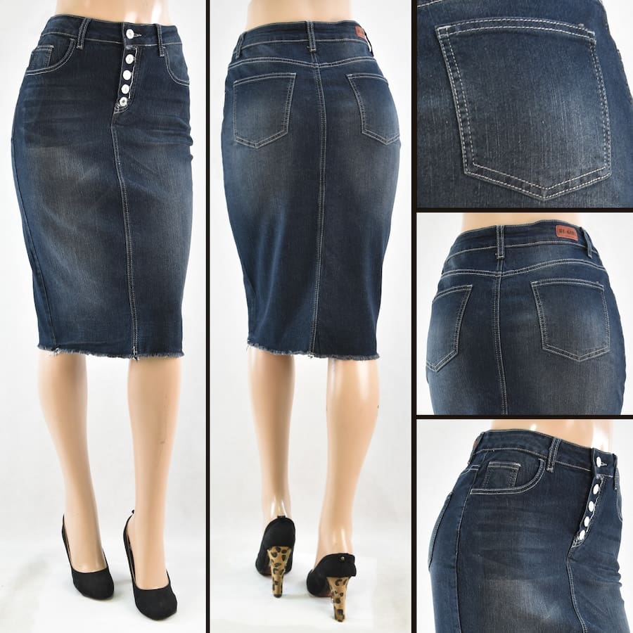 Falda lápiz de mezclilla en tono oscuro de 26” con diseño de botones frontales y acabado deslavado. Disponible exclusivamente para venta al por mayor.