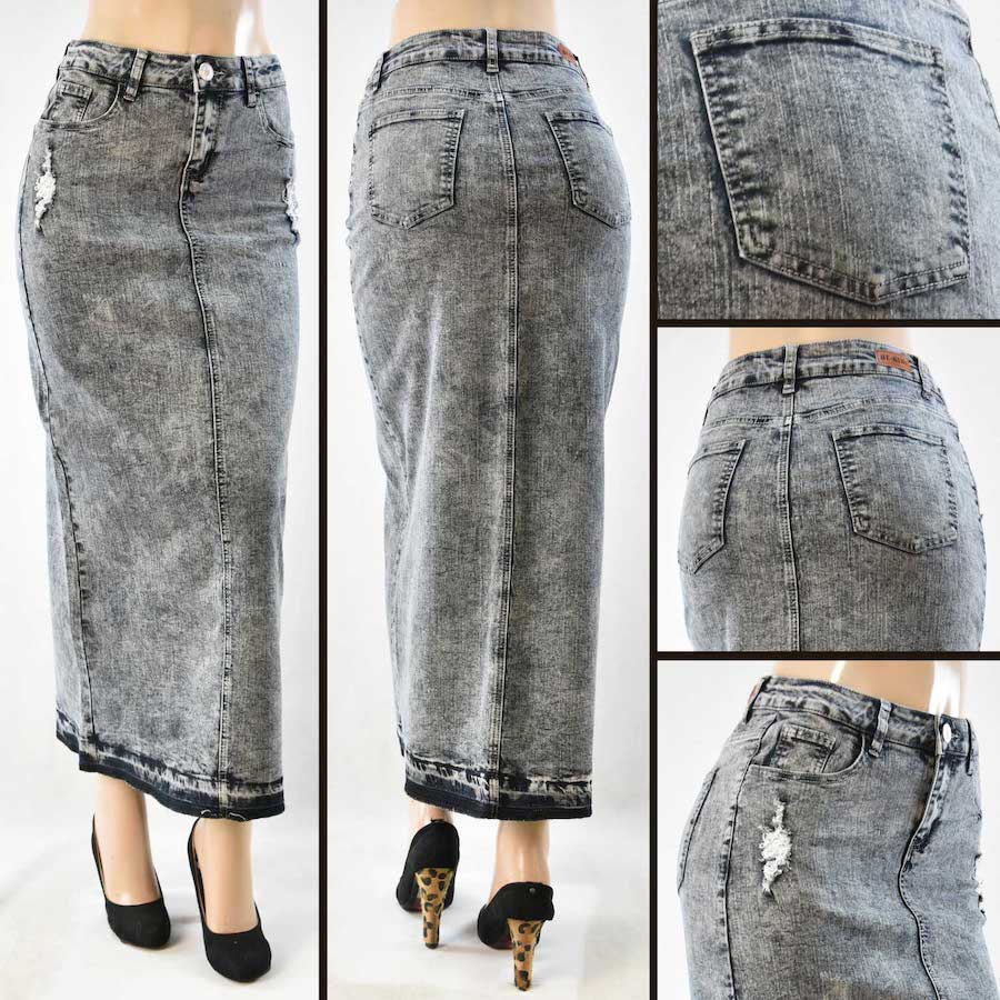 Falda de mezclilla índigo de 38” de largo en color Black Snow con efecto deslavado y toques desgastados. Disponible exclusivamente para venta al por mayor.