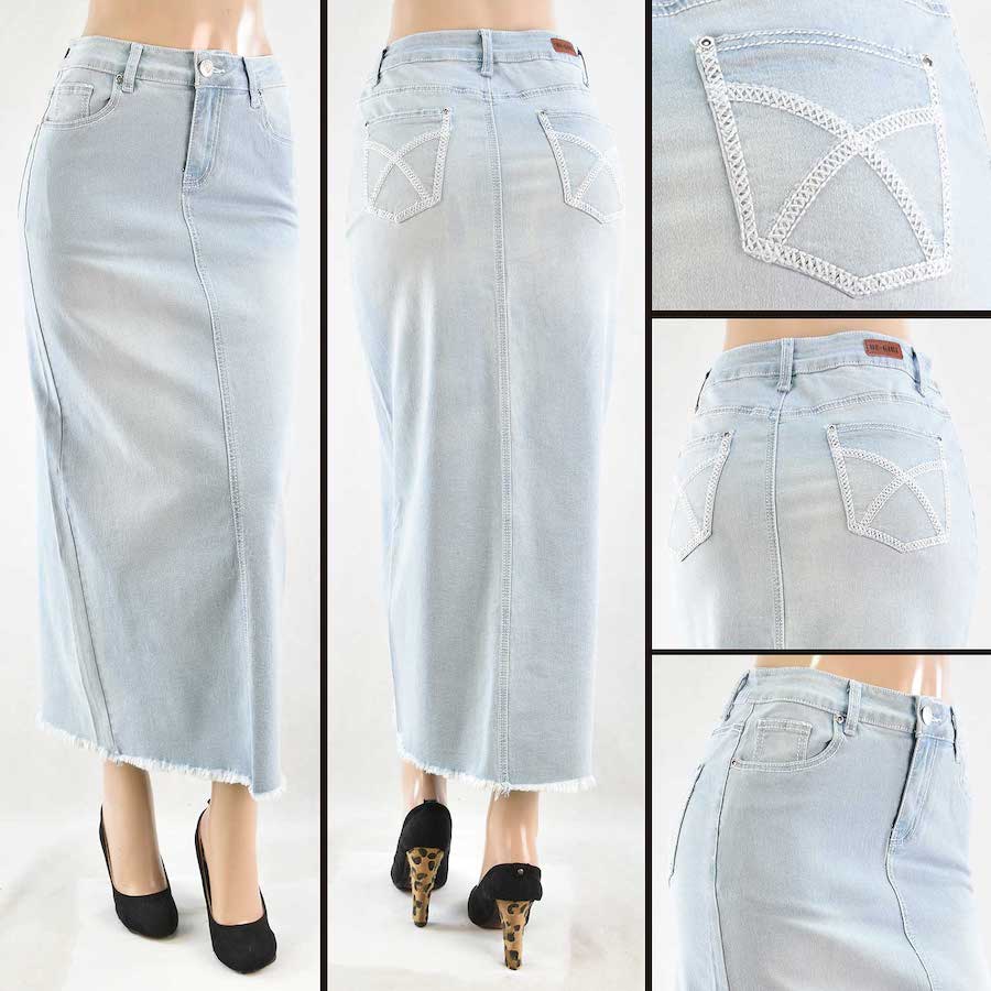 Falda larga de mezclilla clara 37″ de largo con bolsillos bordados en blanco. Disponible exclusivamente para venta al por mayor.